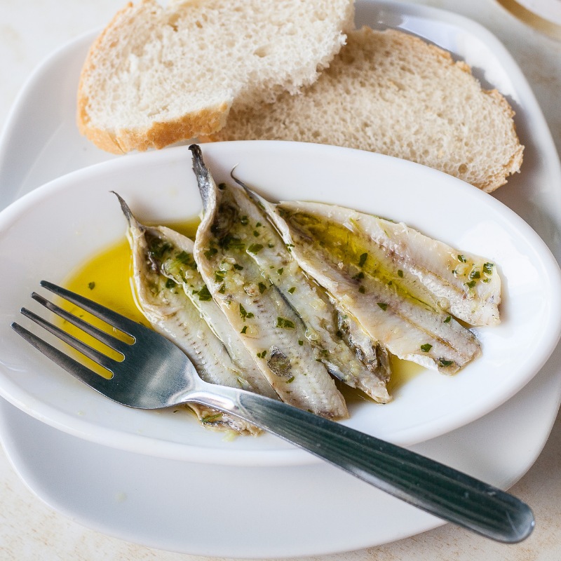 Una tapa que nunca falla. Boquerones frescos, marinados en vinagre suave y servidos con aceite y un toque de ajo y perejil. Una opción ligera, sabrosa y perfecta para los amantes del picoteo tradicional.